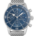 - ヘリテージシリーズ誕生から60周年を迎えた2017年以降、デザインを一新したブライトリングを代表するダイバーズコレクション“スーパーオーシャン”。44mmケースに厚さ16ミリのずっしりとした着け心地は存在感抜群の男らしいモデルです。日付・曜日表記にスモールセコンドと12時間計、クロノグラフ、セラミック製逆回転防止ベゼル、メタルブレスレットを使用したクラシックなデザインとなっています。バックルは二重ロックの片開き式という点も魅力。ムーブメントには「ブライトリング13自動巻クロノメーター」を搭載。200m防水。