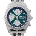 - イタリア空軍のアクロバット飛行チーム“フレッチェ・トリコローリ”との共同開発で1984年に誕生し、多くのモデルチェンジを繰り返しながら不動の人気を維持し続けてきた“クロノマット”。人間工学に基づいたブレスレットや300mを誇る防水機能等、ブライトリングの技術が注ぎ込まれた航空時計の頂上モデルです。無骨なブライトリングらしいスポーツウォッチです。こちらは100本限定モデルでシリアルにその番号も刻まれています。ダイヤルは鮮やかなグリーンにシルバーの三つ目が良く映えています。