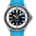 - 2024年に発売された究極のダイバーズ・ウォッチ“スーパーオーシャン”です。こちらはレインボーカラーのインデックス、針と色鮮やかなブルーのストラップが採用されており、定番のモデルにないポップな印象を与えます。装着されているラバーストラップはフォールディングクラスプ式で、最大15 mmの微調整が可能となっています。
