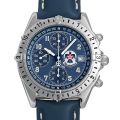 - 人気の高いクロノマットに、文字通り第二次時間帯を表示するGMT機能を搭載した“クロノマット・ロンジチュード”。こちらは中古市場でも殆ど見かけないアメリカ空軍「サンダーバード」のリミテッドエディションです。その証として3時位置にチームエンブレムが配されています。リュウズで簡単にGMT針を操作することが可能で、必要なときだけ針を表示させる事が出来ます。
