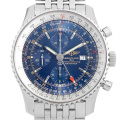 - 2005年からナビタイマーラインに新しく加わったナビタイマー・ワールド。搭載されているキャリバー・ブライトリング24は、第2タイムゾーン表示機能を備え、赤いGTM針が第二時間帯を指し示します。裏蓋には世界主要都市のタイムゾーンを刻印。ケース径46mm、厚さ15.5mmとかなりの大型モデルです。3気圧防水。