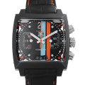 - 最も過酷なレースとして有名な「ルマン24」に敬意を表し発表されたモナコ24。映画「栄光のル・マン」の劇中にスティーブ・マックィーンがドライブしたポルシェ「ガルフ917K」からインスパイアを受けた、ブラックカラーにストライプ柄の文字盤を備えているのが特徴です。裏蓋はシースルーバックです。100m防水。