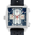 - 1969年に世界初の角型防水ケースを実現させたホイヤー・モナコ。スティーブ・マックイーンが1971年公開の名作カーレース映画『栄光のル・マン』の中で着用したモデルとして知られています。こちらのモデルはスティーブ・マックイーンが映画で着用していたレーシングスーツがダイアル上に表現されています。オリジナルと同じように左側にセットされたリューズがファンにはたまらない仕様となっています。