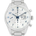 - モーターレースからインスピレーションを受けて誕生した“カレラ”。こちらはホワイトオパーリンをベースにブルーをアクセントにした3カウンタークロノグラフで、スタイリッシュなデザインが印象的なモデルです。日本限定500本。ムーブメントは自動巻き“キャリバー16”を搭載。パワーリザーブ42時間、防水性100m。