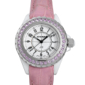 - 2000年、シャネル初のスポーツウォッチとして発売された“J12”。こちらはベゼルにピンクサファイアをあしらった高級感溢れるモデルです。材質には高硬度という特性を持つセラミックを使用しているため、傷が付きにくく取り扱いが楽な時計でもあります。機能とデザインを併せ持った高級ウォッチです。