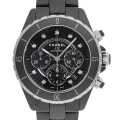 - シャネル渾身の力作であり、2000年の発表から世界中で人気を博している"J12"コレクション。こちらはインデックスに9ポイントのダイヤをセットしたエレガントなモデルです。材質には高硬度という特性を持つセラミックを使用しているため、傷が付きにくく取り扱いが楽な時計でもあります。200mの防水設計がされており、マリンスポーツにも対応可能です。