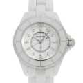 - 2000年に華々しいデビューを飾り時計界に革命を与えたと言われるJ12シリーズ。セラミックをケースとブレスレットに採用するという斬新な作りが魅力的で、瞬く間に多くのファンの心をとらえ世界中で爆発的ヒットを収めました。インデックスに配された8ポイントのダイヤモンドが、より一層の高級感を演出しています。ケースには200mの防水設計がされており、マリンスポーツにも対応可能です。