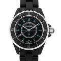 - シャネル初のスポーツウォッチとして誕生し、2000年に華々しいデビューを飾り時計界に革命を与えたと言われる“J12”シリーズ。セラミックをケースとブレスレットに採用するという斬新な作りが魅力的で、瞬く間に多くのファンの心をとらえ世界中で爆発的ヒットを収めました。今や様々なアレンジバージョンが存在する人気モデルで、こちらはインデックスに12個のエメラルドを配したデザインとなっています。オールブラックのなかに映えるエメラルドグリーンカラーが神秘的な珍しいモデルです。