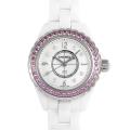 - 2000年、シャネル初のスポーツウォッチとして発売された「J12」。こちらはベゼルに40個のピンクサファイア、インデックスに8個のダイヤモンドをあしらった高級感溢れるモデルです。材質には高硬度という特性を持つセラミックを使用しているため、傷が付きにくく取り扱いが楽な時計でもあります。優れたデザイン性の中に、クロノメーター規格ムーブメントを採用するなど、機能とデザインを併せ持った高級ウォッチです。