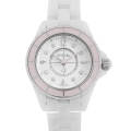 - 2015年発表、世界1200本限定の”J12 ソフトピンク”です。ROSE、MINT、BLUEの三色がラインナップされ、ケース径も29mm、33mm、38mmと多彩ですが、こちらは「ROSE」の29mmモデルです。パステルピンクカラーの逆回転防止ベゼル、インデックス、秒針が可愛らしい印象です。