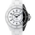 - シャネル渾身の力作であり、2000年の発表から世界中で人気を博しているJ12”。こちらは、J12が誕生してから20周年を迎えた記念すべき2020年に発表されました。ココ・シャネルの語録に、「黒はオールマイティ。白も同じ。この2色は、絶対的な美しさの象徴。見事に完璧な調和。」とありますが、その2色を併せた美しく完璧な調和がとれたモデルとなっています。ケースバックはシースルーになり、ムーブメントの動きが楽しめます。シャネル独自の新しい自動巻きムーブメント「キャリバー 12.1」を搭載。50m防水。