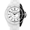 - シャネル渾身の力作であり、2000年の発表から世界中で人気を博している“J12”。こちらは、J12が誕生してから20周年を迎えた記念すべき2020年に発表されました。ココ・シャネルの語録に、「黒はオールマイティ。白も同じ。この2色は、絶対的な美しさの象徴。見事に完璧な調和。」とありますが、その2色を併せた美しく完璧な調和がとれたモデルとなっています。ケースバックはシースルーになり、ムーブメントの動きが楽しめます。シャネル独自の新しい自動巻きムーブメント「キャリバー 12.1」を搭載。50m防水。