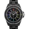 - シャネルのフラグシップでもあるJ12ですが、差し色としてレインボーカラーが用いられていることが大きな特徴です。さながらダンスフロアのリズムが聞こえてくるような、そんな一本に仕上がりました。防水性は50m。世界限定1225本生産。