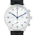- 1930年代、ポルトガルの商人がオーダーメイドした時計を原形として製造が開始されたポルトギーゼ。すっきりとしたシルバー文字盤に、ブルーの針とアラビアインデックスが上品で美しいモデルです。ムーブメントには同社の高い技術力が生み出した毎時28,800振動のCal.69355を搭載しています。3気圧防水。パワーリザーブ46時間。こちらは、両開きDバックルを搭載した2019年発表モデルです。