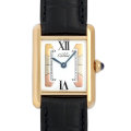- カルティエのロングセラーモデル“マストタンク”。「ヴェルメイユ」と呼ばれるシルバー925にゴールドコーティングしたケースが特徴です。派手過ぎず落ち着いたデザインは、シーンや身につける方の年代を問わず、幅広い層に受け入れられています。ダイアルバリエーションが豊富なのも、この“マストタンク”の特徴で、こちらはローマンインデックスは12時と6時のみで、それ以外の時間帯はイエローゴールド、ホワイトゴールド、ローズゴールドのタイルが配されています。