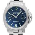 - 落ち着いた雰囲気のルミノール マリーナです。9時位置にスモールセコンド、3時位置にデイト表示を配置。針に蛍光塗料を使用しているため薄暗い中でもしっかり時間が読み取れます。パネライとしては小振りな40mmサイズのため、女性にもお勧めできるモデルです。光沢のあるブルーダイアルに三針+カレンダーのシンプルな仕上がりです。