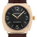- ラジオミールは、"ルミノール"と並んでパネライを代表する人気コレクションの一つです。ブランド初の腕時計として誕生した歴史を持ち、シンプルなクッション型ケースがクラシカルな雰囲気を醸し出します。こちらは、肌馴染みの良いピンクゴールド製ケースを採用。シースルーバックからは美しく装飾が施された手巻きムーブメント「Cal.OPX」を眺めることができます。ステンレスモデルでは味わえない上品さと重厚感が魅力の一本です。