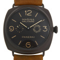 - 2010年に1500本限定で発売されたスペシャルエディションです。ケースと尾錠にパネライが開発したアルミニウムベースの新素材「コンポジット」を使用し、驚くほどの軽量化を実現しています。ムーブメントには自社製手巻きキャリバーP.2002/7を搭載し、一度巻き上げれば8日間続けて稼働する8デイズ仕様です。巻き止まりがなく、自動巻きのムーブメントのように巻き切るとスリップします。ストラップはヴィンテージ加工を施したカーフ。ケースやダイアルの色と上手く調和しており、レトロな印象を与えます。