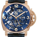 - パネライの最高峰のモデルでトゥールビヨンを搭載。パネライ独自のゴールド素材「ゴールテック」は、ピンクゴールドほど明るくはなく赤味があり、落ち着きのある輝きが魅力です。この色味のゴールドは、日本人の肌色にとても馴染みやすく温かみのある印象を与えます。また、少量のプラチナを配合することで金属の酸化を防ぐ効果があり、美しい色味を長く保つことが可能です。グリュシデュール製テンプ、インカブロック耐震機構を使用。パネライブティック限定モデルです。
