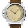 - 過酷な軍事環境での使用を念頭に置き、いかなる条件のもとでも高い性能を発揮する腕時計として 設計された“ルミノール”。9時位置のリュウズとリュウズプロテクターが特徴的で、左利きの方にも最適なモデルです。こちらの最大の特徴はグレイン仕上を施した珍しいベージュダイアル。アンティークウォッチを彷彿とさせるデザインは、ビジネスはもちろんカジュアル、フォーマルまでマルチに活躍できる1本です。