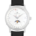 - 優雅さと機能性を持ち合わせたマスターコレクションから、ムーンフェイズを備えたトリプルカレンダーを入荷しました。ダイアル中央に曜日と月のウィンドウ、ダイアル外周にポインターデイト、6時のインダイアルにムーンフェイズを備えています。複雑機能をシンプルにまとめたジャガー・ルクルトらしい逸品です。バックスケルトンからは美しい仕上げの自動巻きムーブメントをご覧頂けます。5気圧防水。
