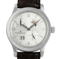 - パワーリザーブ、ビッグカレンダー、スモールセコンド、デイ&ナイト表示と多機能でありながらシンプルにまとめられている外観が、ジャガールクルトらしいモデルです。シースルーバックからは綺麗に装飾の施された3/4プレートのCal.877をお楽しみ頂けます。ツインバレルを採用したことにより、8日間のパワーリザーブが可能です。5気圧防水。