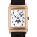 - ラテン語で「回転させる」という意味を持つレベルソ。1930年頃、貴族の間で盛んだったポロ競技で運動中の衝撃からガラスとダイヤルを保護する目的で考案された時計です。ケースそのものを180度回転するという構造は、当時革新的な技術として多くの注目を集めました。レクタンギュラー(長方形)にこだわった角型ムーブメントは、世界に唯一ジャガー・ルクルトだけが専用かつオリジナルを追及し開発を続けています。表側にはムーンフェイズ、パワーリザーブ、ナイト&デイ、スモールセコンドを配し、裏側はシースルーバックのため精巧なムーブメントをご覧いただけます。