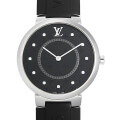 - メンズ・レディースを問わず人気が高く、ルイヴィトンの定番として存在し続けるタンブールシリーズ。厚みのあるケースが特徴的で、その力強く存在感のあるフォルムは16世紀に南ドイツで作られたドラム型時計、つまり世界初の旅行用時計に由来しています。こちらは、モノグラムパターンのホログラムを施したブラックダイアルに配された、繊細なダイヤモンドのインデックスがエレガンスで、絶妙な美しさを演出しています。