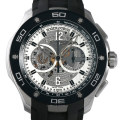 - ロジェ・デュブイが示す4つの世界観のうちの一つ“ベンチャラー(冒険者)”を表現した「パルジョン」シリーズ。最大の特徴は素材感を前面に押し出したサファイアガラスです。直接ビス留めされたサファイアガラスがベゼル部分まで覆い独特の雰囲気を作り出しています。搭載ムーブメントは自動巻きRD680。パワーリザーブ約52時間。ジュネーブシールの刻印有。COSC認定取得。10気圧防水。