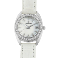 - “エレガンス コレクション”の26mmの小ぶりなレディースクォーツモデルです。可愛らしいホワイトシェルダイヤルは角度によってほのかに輝きを放ちます。ステンレスケースが控えめながらも、ベゼルとインデックスにダイヤモンドが配されているため華やかで上品な印象を与えます。日常生活用強化防水(10気圧)。