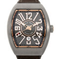 - 新たな曲線(カーベックス)を携えるコレクション“ヴァンガード”。ケースにベルトを没入させたラグなし一体構造が最大の特徴です。インデックスはヴァンガードのためにデザインされた立体的なアラビア数字。こちらのモデルはチタンとピンクゴールドのコンビネーションが、スポーツ・エレガンスを見事体現した一本です。力強く、迫力のある表情を作りながらも、上品さを醸し出すところはさすがフランクミュラーと言えます。日常生活防水。