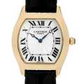 - 1920年代にはカルティエの代表作の一つとなったトーチュ。1912年に創作されてから続くアヴァンギャルドなスタイルを持ったこの時計は、カルティエの美に対するこだわりが最も強く表現されたモデルのひとつです。亀甲をモチーフにした滑らかな流線型のケースに、針軸の周りにあしらわれるバラのモチーフと、それを中心として放射状に広がっていくギョーシェ彫りが配されているのが特徴で、文字盤を立体的に見せ表情を豊かにしています。