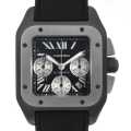 - こちらの"サントス"は、コーティングが施されたケースの色味と、ベゼルに用いられたチタンの質感、ストラップの組み合わせが非常に絶妙で、宝飾ブランドであるカルティエとしては珍しく、どこかミリタリーテイストを感じさせる男性的な仕上がりとなっています。航空機のボディを思わせる力強いデザインのベゼルにはチタン素材を採用し、カルティエならではのローマンインデックス文字盤が、他にはない独自の世界観を表現しています。クロノグラフを搭載することで、機械式時計の魅力をより深く味わえる、男性心をくすぐる一本ではないでしょうか。メカニカルな印象が強く、無骨で「男前」な雰囲気を楽しめる一本と言えます。