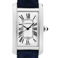 - 1930年代にカルティエのニューヨーク店が生み出したと言われているタンクアメリカン。縦に伸びたスクエアケースが特徴で、他のタンクシリーズとは一線を画す独特なデザインが人気のモデルです。シンプルなシルバー文字盤の中に配された上品なローマンインデックスが絶妙のコントラスト。 八角形のリューズにはサファイヤが埋め込まれており、シャープな中にエレガントさも兼ね備えています。