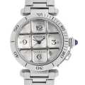 - カルティエを代表する人気モデルパシャ。ギョーシェ彫りを施したシルバーダイアルやサファイアのカボションを使用することで、お洒落な雰囲気に仕上がっております。グリッド部分は取り外しが可能ですので、その日の気分に合わせて二面性をお楽しみいただけます。またスケルトンバックになっておりクリスタル越しにムーブメントをご覧頂くことが可能です。