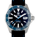 - タグ・ホイヤーのダイバーズウォッチ「アクアレーサー」コレクション。こちらは深いブルーのセラミック製ベゼルが特徴的なモデルですベルトにはナイロンストラップを採用し、ウエットスーツの上からでも扱いやすいように考慮されています。ムーブメントはタグ・ホイヤー製・キャリバー5です。300m防水。