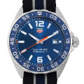 - F1のテクノロジーにインスピレーションを得たタグホイヤーの“フォーミュラ1”コレクション。カジュアルなスタイルに、F1という極限下の環境でも活躍できる機能性を兼ね備えています。サンレイ加工が施されたブルーダイアルにアルミニウム製の回転ベゼル、そしてオレンジのセンターセコンド針のアクセントが印象的な仕上がりとなっています。NATO製のストラップを採用したモデルで、装着感も抜群です。
