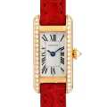 - “アロンジェ”とはフランス語で「伸ばす・長くする」という意味であり、ほかのタンクコレクションに比べて縦に伸びたケースが特徴的なモデルです。こちらは文字盤の両サイドにダイヤがセッティングされた華やかなモデルです。また日本限定の貴重な1本です。