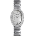 - ベニュワールは柔らかな曲線の楕円形ケースが特徴で、仏語でバスタブを意味します。カルティエの創業者であるルイ・カルティエがロシアのマリア・パヴロヴナ公爵夫人に時計を贈った際、夫人が『浴槽みたいね!』と言ったことから、ベニュワールと名付けられました。ホワイトゴールドのミニケースにセッティングされたダイヤモンドがとても美しく印象的で、手首を華やかに演出してくれます。