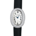 - “ベニュワール”は、カルティエの創業者ルイ・カルティエがロシアのマリア・パヴロヴナ公爵夫人に時計を贈った際、夫人が「バスタブみたいね!」と言ったことからその名が付けられました。こちらはケースにホワイトゴールドを使用し、ベゼルに二重のダイヤモンドを配した高級感溢れるモデルです。