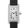 - 優美な縦長ケースが特徴の“タンクアメリカン”。ステンレススティール製のモデルはなく、素材にゴールドを使用したモデルだけがラインナップされているゴージャスなコレクションです。ケースの両サイドは滑らかな曲線になっており、手首におさまりが良く、しっくりと馴染むデザインです。こちらはサイドに2列セッティングされたダイヤモンドとダイアルのギョーシェが高級感を纏ったモデルです。