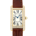 - 優美な縦長ケースが特徴の“タンクアメリカン”。ステンレススティール製のモデルはなく、素材にゴールドを使用したモデルだけがラインナップされているゴージャスなコレクションです。ケースの両サイドは滑らかな曲線になっており、手首におさまりが良く、しっくりと馴染むデザインです。こちらはベゼルとリューズにダイヤを配した華やかなモデルです。