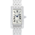 - タンクアメリカンに待望のミニサイズが登場しました。従来のサイズに比べ一回り小振りなサイズは、タンクアメリカンコレクションの中でも人気のモデルです。ベゼルとリューズにはダイヤモンドが施されており、控えめながら華やかな雰囲気の一本です。