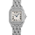 - カルティエウォッチの中でも名作と呼ばれてる「パンテール ドゥ カルティエ ウォッチ」。ホワイトゴールド素材を使用し、ベゼル部分に2重にダイアモンドをセッティングした人気の高い仕様です。すでに生産は終了しておりユーズド市場でも見かける事が少なくなってきました。腕時計としての機能はもちろんですが、ブレスレットとしてジュエリー感覚でご使用いただけるのも、長年に渡り人気が継続している由縁なのかもしれません。