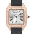 - ルイ・カルティエが飛行家アルベルト・サントス・デュモンの要請を受けて製造した腕時計サントス。当時、円形の懐中時計しか存在しなかった時代に角型という斬新なデザインで発表されました。誕生してから100年以上経ちますが、長年カルティエを代表するおしゃれなメンズモデルとして愛され続けてきました。こちらはピンクゴールドのケースに、ローマンインデックスといったシンプルながら上品なデザインは、どのような場面にも映えるモデルです。日常生活防水。2019年発表モデル。