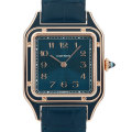 - 1904年、飛行家『アルベルト・サントス・デュモン』のために『ルイ・カルティエ』が製作した腕時計を原型とする"サントス デュモン"コレクションに属する、洗練されたデザインと豊かな歴史を兼ね備えたラグジュアリーモデルです。ピーコックブルーのサンレイ仕上げラッカー文字盤が特徴的です。カルティエのクラフツマンシップと航空史へのオマージュが融合した、非常に芸術性の高いタイムピースです。