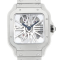 - ルイ・カルティエが飛行家アルベルト・サントス=デュモンの要請を受けて製造した腕時計サントス。 初出から100年以上経ちますが、長年カルティエを代表するおしゃれなメンズモデルとして愛され続けてきました。こちらはそのサントスの2018年発表モデルとなります。スケルトンの文字盤という個性的ながら洗練されたデザインに仕上がっています。クイックスイッチインターチェンジャブルという、付属の替ベルトへの交換を容易にしたシステムを引き続き採用。手巻きCal.9611 MC搭載。10気圧防水。