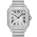 - カルティエを代表するサントスウォッチ。飛行士であるアルベルト・サントス・デュモンから「飛行中に見やすい腕時計を」という意見から生まれたサントスは、 円形の懐中時計しか存在しなかった時代に角型という斬新なデザインで発表されました。2018年発表のこちらは、ステンレススチールケースにシルバーダイアル、ローマインデックスといったシンプルながらどのような場面にでもお使い頂けるデザインです。10気圧防水。