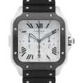 - ルイ・カルティエが飛行家アルベルト・サントス・デュモンの要請を受けて製造した腕時計サントス。初出から100年以上経ちますが、長年カルティエを代表するおしゃれなメンズモデルとして愛され続けてきました。こちらはそのサントスの2019年発表モデルとなります。クイックスイッチインターチェンジャブルという、ベルト交換を容易にしたシステムとクロノグラフ機能を搭載。DLC加工を施したベゼルが特徴的で目を惹くモデルとなっております。