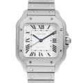 - カルティエを代表するモデル"サントス"。飛行士である『アルベルト・サントス・デュモン』から「飛行中に見やすい腕時計を」という意見から生まれた"サントス"は、 円形の懐中時計しか存在しなかった時代に角型という斬新なデザインで発表されました。ステンレススティールケースにシルバーダイアルとローマインデックスといった、洗練されたシンプルな仕上がりはどのような場面でも活躍できるデザインです。